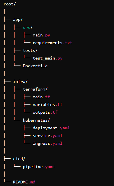 infra/ holds the infrastructure-as-code files, such as Terraform and k8s manifests.