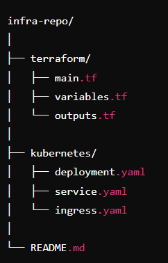 When keeping application and infrastructure code in separate repositories, each can be organized independently. Here’s how you might structure them: